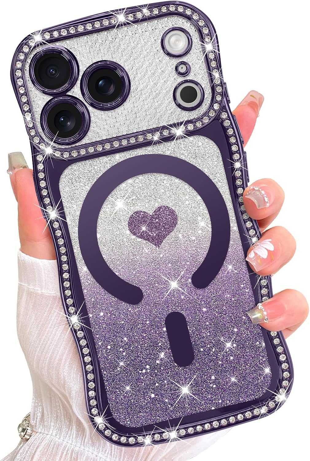 AIGOMARA Magnetic for iPhone 17 Case, Compatible with Magsafe, Curly Wave Edge, Cute Love Heart Plated Glitter Bling Rhinestone for Women Girls, Soft TPU Camera Protection Phone Cover, Purple